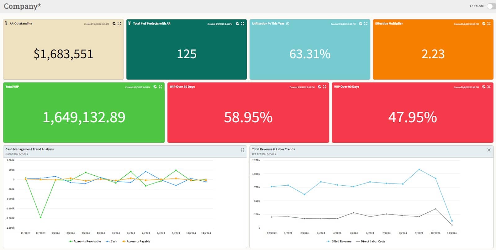 High-performing organizations don’t wait for end-of-month reports to make decisions. With dashboards, you can deliver real-time visibility into company health — whether it’s tracking cash trends or surfacing KPIs for leadership. A simple Cash Management Trend Analysis dashboard can compare Accounts Receivable, Accounts Payable, and cash flow month by month, giving you immediate insight into your financial standing.